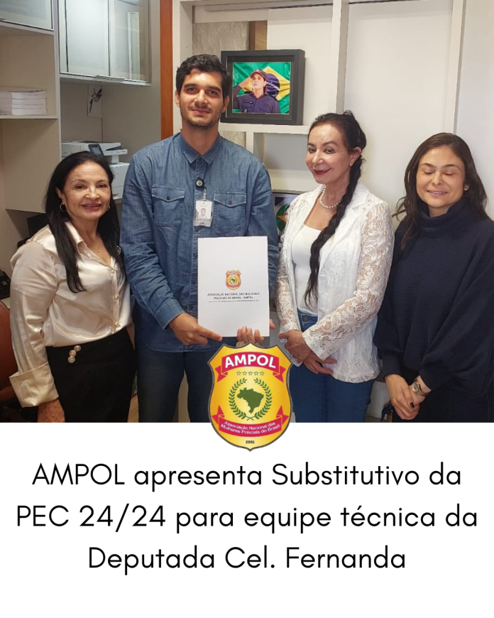 Na manhã de ontem (06), a Presidente da AMPOL, Dra. Creusa Camelier, acompanhada das associadas Marcia Almeida e Saranita Sabença, se reuniram com a equipe técnica da deputada Coronel Fernanda para a apresentação do Substitutivo da PEC 24/24 uma vez que deputada encontra-se viajando em missão oficial. A recepção foi excelente e foi apresentado um Substitutivo sem emendas, apenas extraímos os dispositivos essenciais do texto da PEC 24/24, como tínhamos combinado de antemão com a deputada de enxugarmos o texto da PEC 24/24, retirando os dispositivos referentes às cotas de pensões para os dependentes, mesmo porque preservamos a pensão integral com paridade para o cônjuge, independentemente da “causa mortis”, estando na atividade ou aposentado, podendo o cônjuge continuar recebendo também o seu salário ou provento.